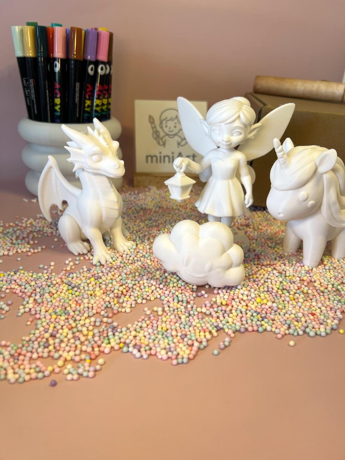 Cada caja incluye rotuladores acrílicos para pintar tus figuras y un pergamino con la historia de los personajes encantados que habitan este universo lleno de color. Una experiencia creativa que estimula la imaginación, la concentración y la expresión artística, ayudando a los niños a desconectarse de las pantallas y sumergirse en un mundo donde todo es posible.